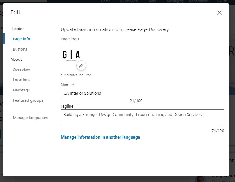 I suggest you create a banner for your company page that resembles your brand and website. Remember, in branding, we want every marketing support piece to feel similar. It doesn’t have to look the same, just similar, so it is tied together in the viewers’ minds. (Click the pencil icon in each section to add information.) The banner should be a 1,128px x 191px.