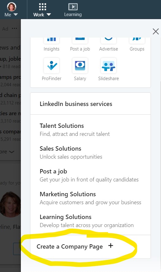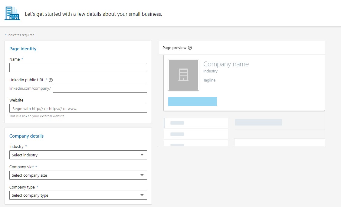 Under the work tab, scroll to the bottom of the popup and select “Create a Company Page.” Next, LinkedIn will ask you about your “type of business.” There are four options – small business, medium to large business, showcase pages, and educational institutions. Select the one that is most appropriate for your business.